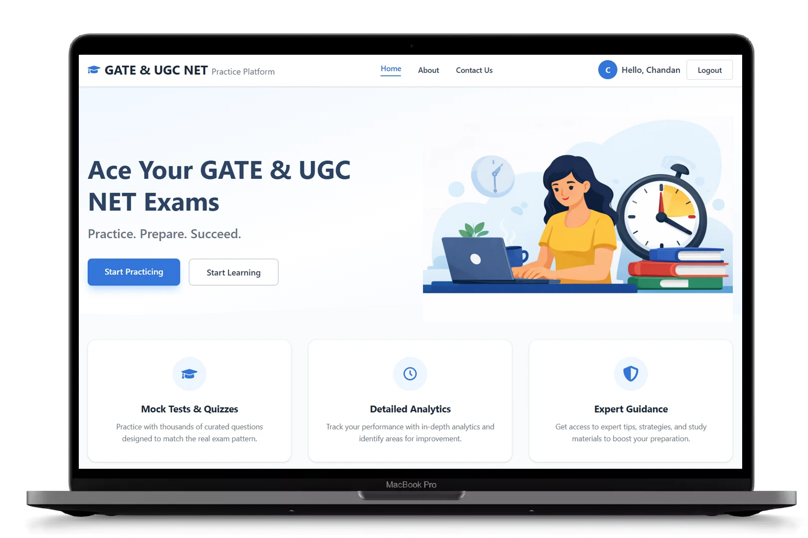 GATE & UGC-NET Practice Platform is a full-stack web application developed as my final year college project, designed to help students prepare effectively for competitive exams. As the team leader, I managed project planning, coordinated development tasks, and contributed to both the frontend and backend implementation.